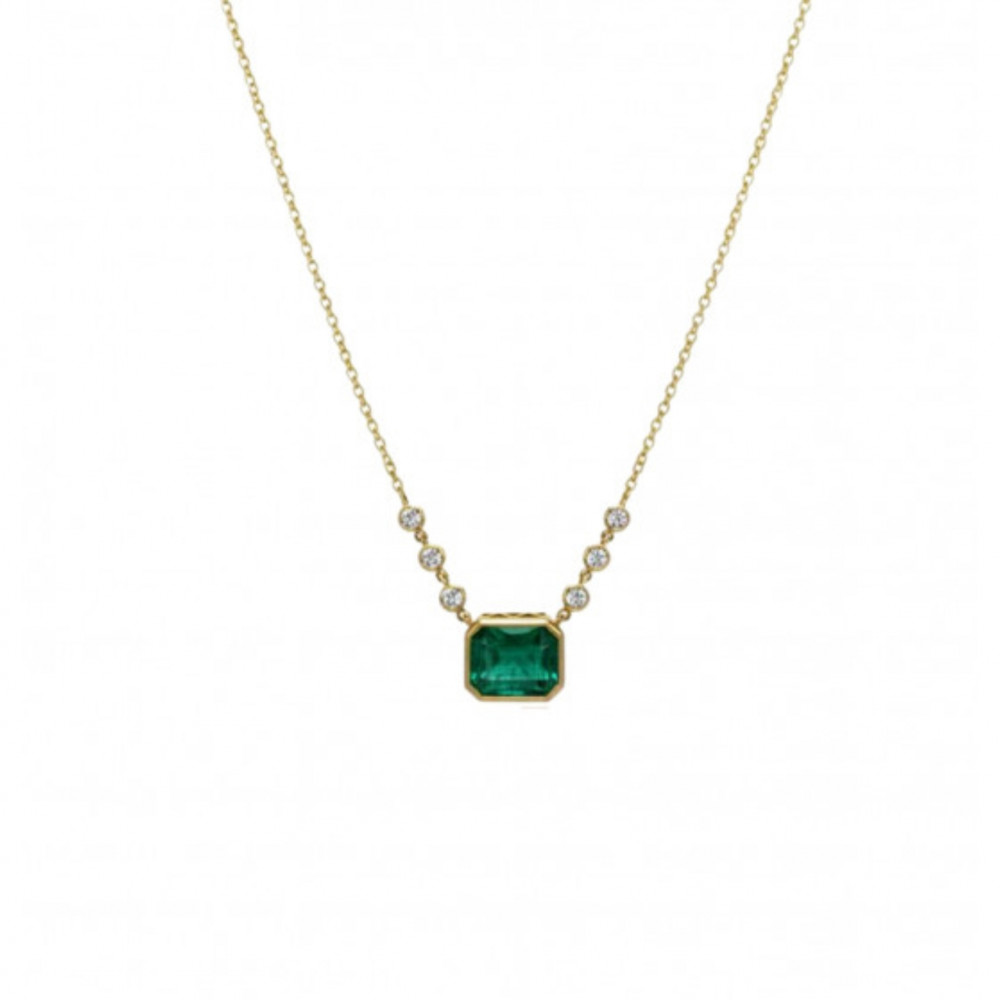 Elegant 18k yellow gold necklace with an emerald-cut emerald pendant, bezel-set, and accented by small brilliant-cut diamonds. Short chain length for a classic look