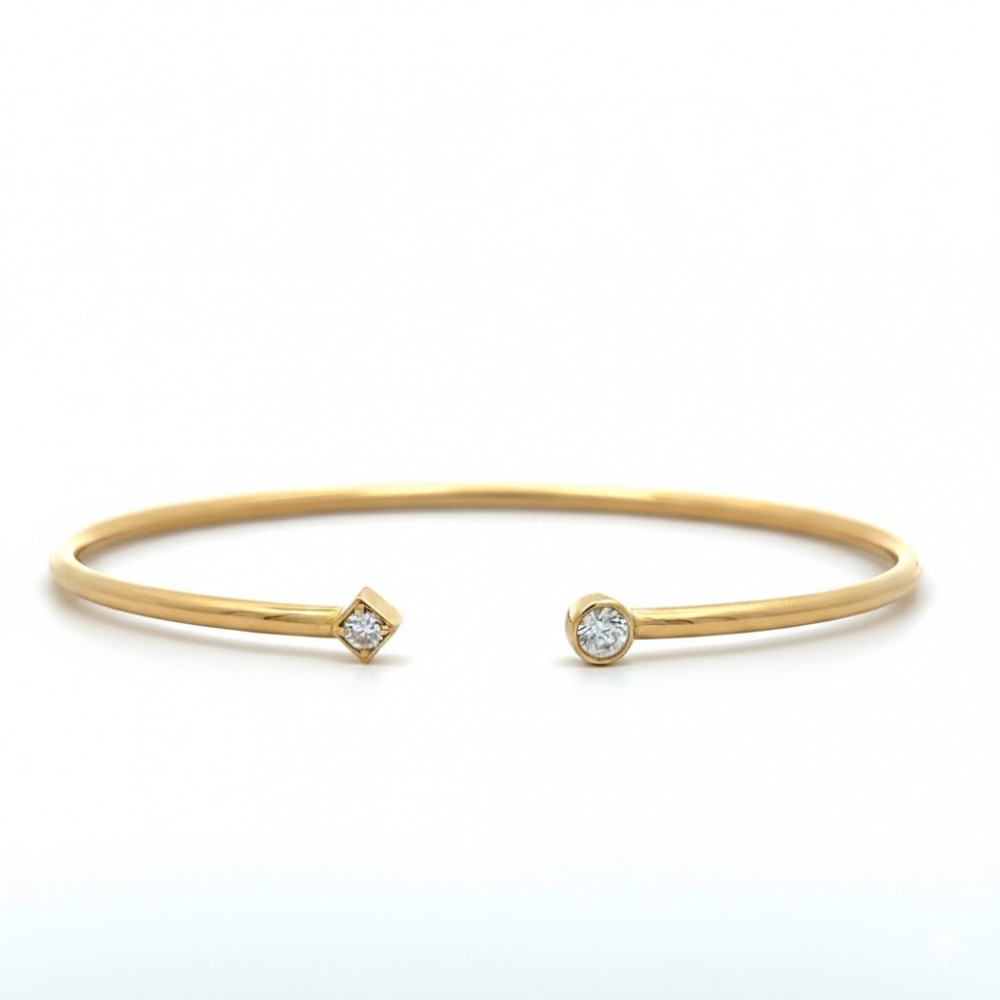 A refined open bracelet featuring two diamonds in bold geometric settings.